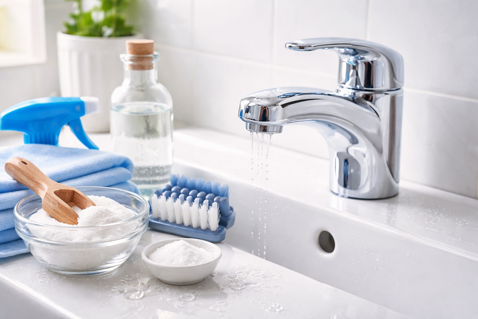 Konvensjonell bordeddik (9 %) er utmerket til vannstein på vertikale flater eller rundt bunnen av blandebatteriet, der det ofte samler seg vann. Det viktigste trikset her er å øke eksponeringstiden.